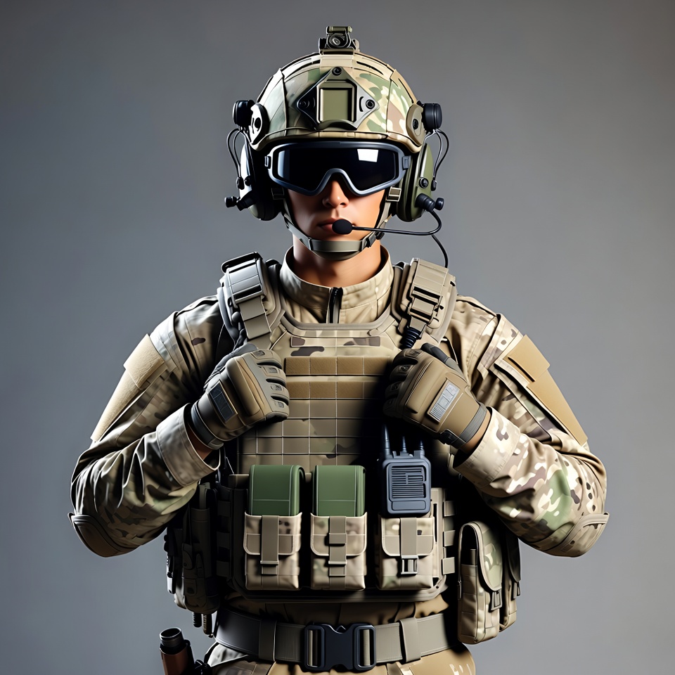 army, camouflage, combat vest, gloves, gray background, headset, helmet, isolated background, male, military, multicam uniform, night vision goggles, operator, plate carrier, pouches, radio, special forces, tactical gear, soldier