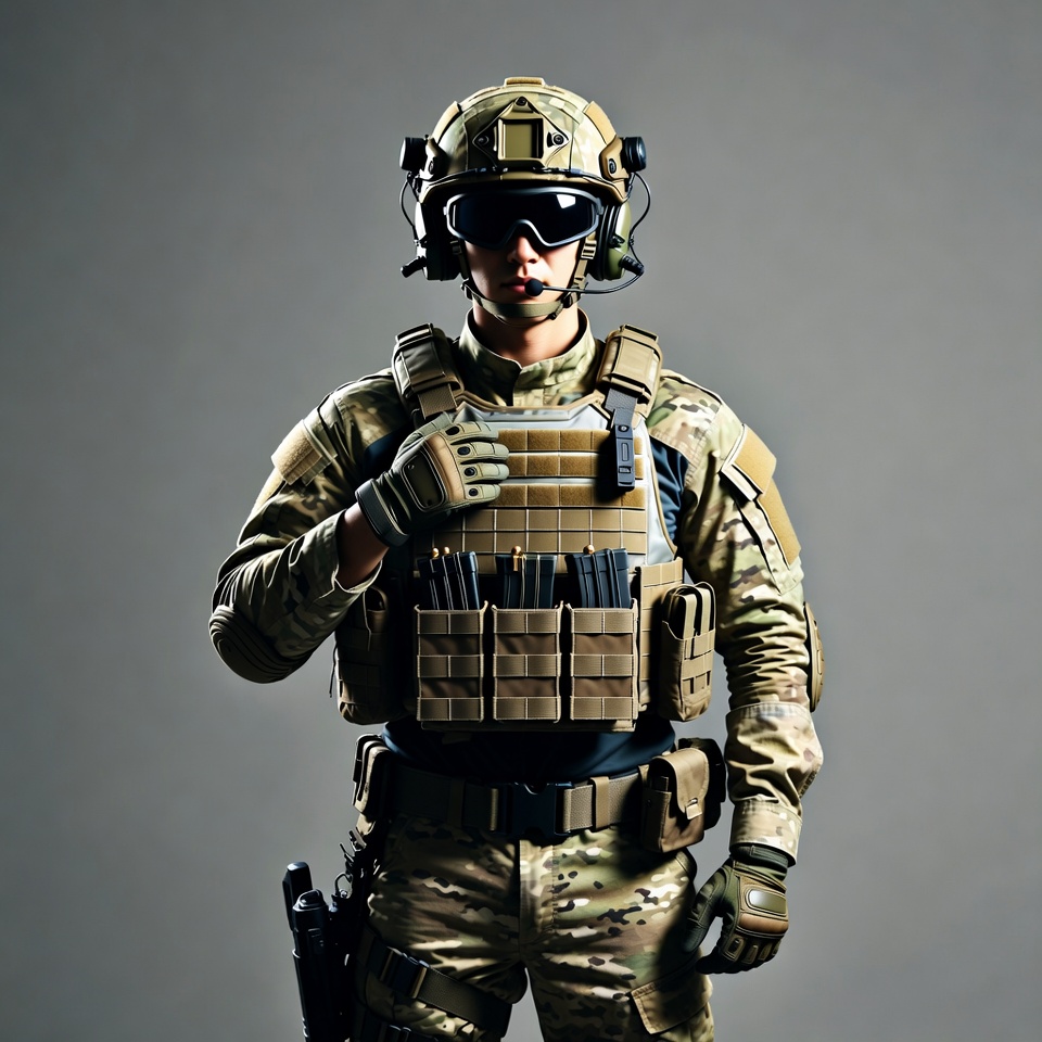 A male soldier stands in full tactical gear against a gray background. He wears a helmet with night vision goggles, sunglasses, gloves, and a plate carrier loaded with magazines. He has a radio on his shoulder and a rifle holstered on his leg.