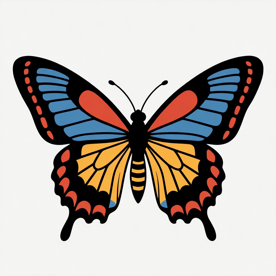 black outlines, blue wings, butterfly illustration, clipart, colorful butterfly, insect, isolated background, nature graphic, orange patterns, red borders, vector butterfly, wings, yellow body, butterfly