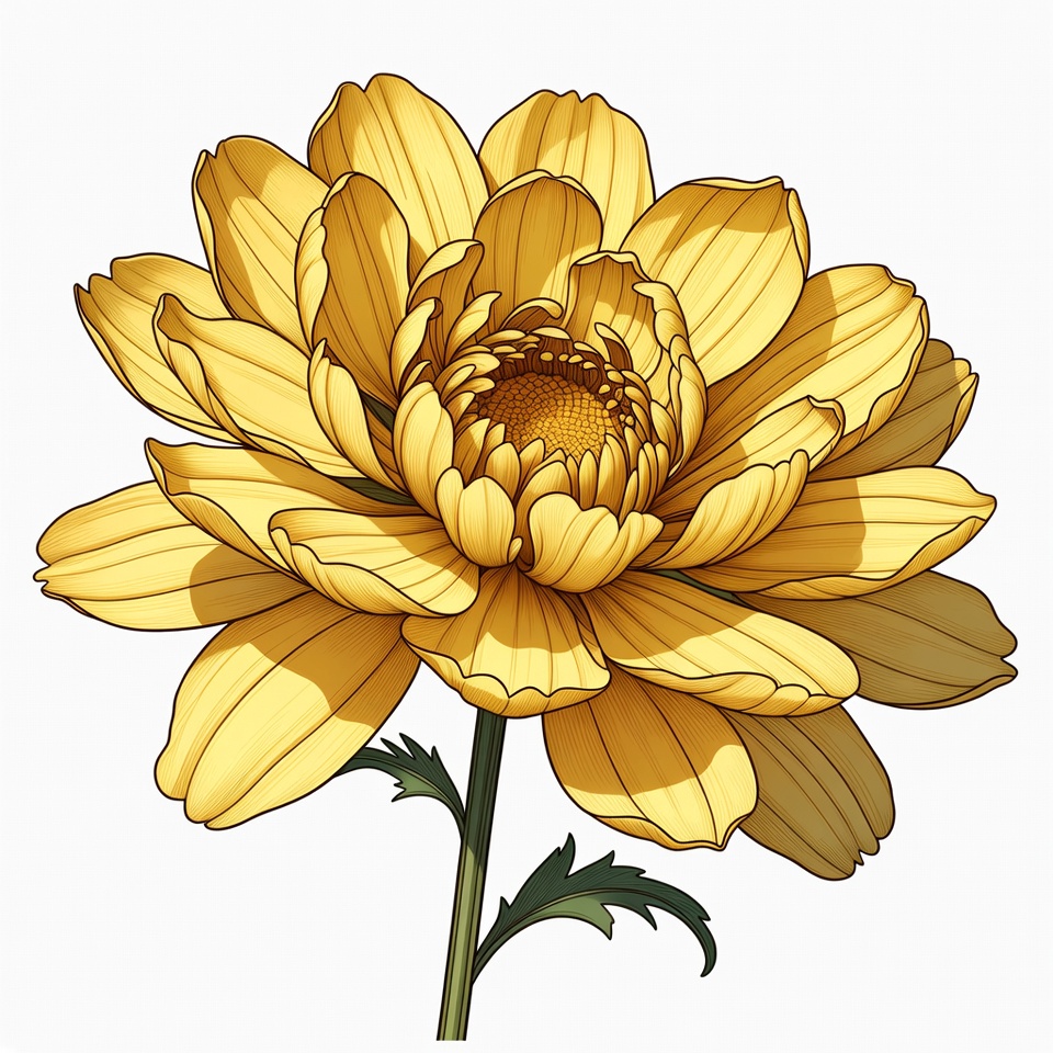 A vibrant yellow chrysanthemum flower with numerous layered petals is depicted in a detailed illustration. The flower features a bright yellow center and a slender green stem with leaves. It is presented on an isolated white background.