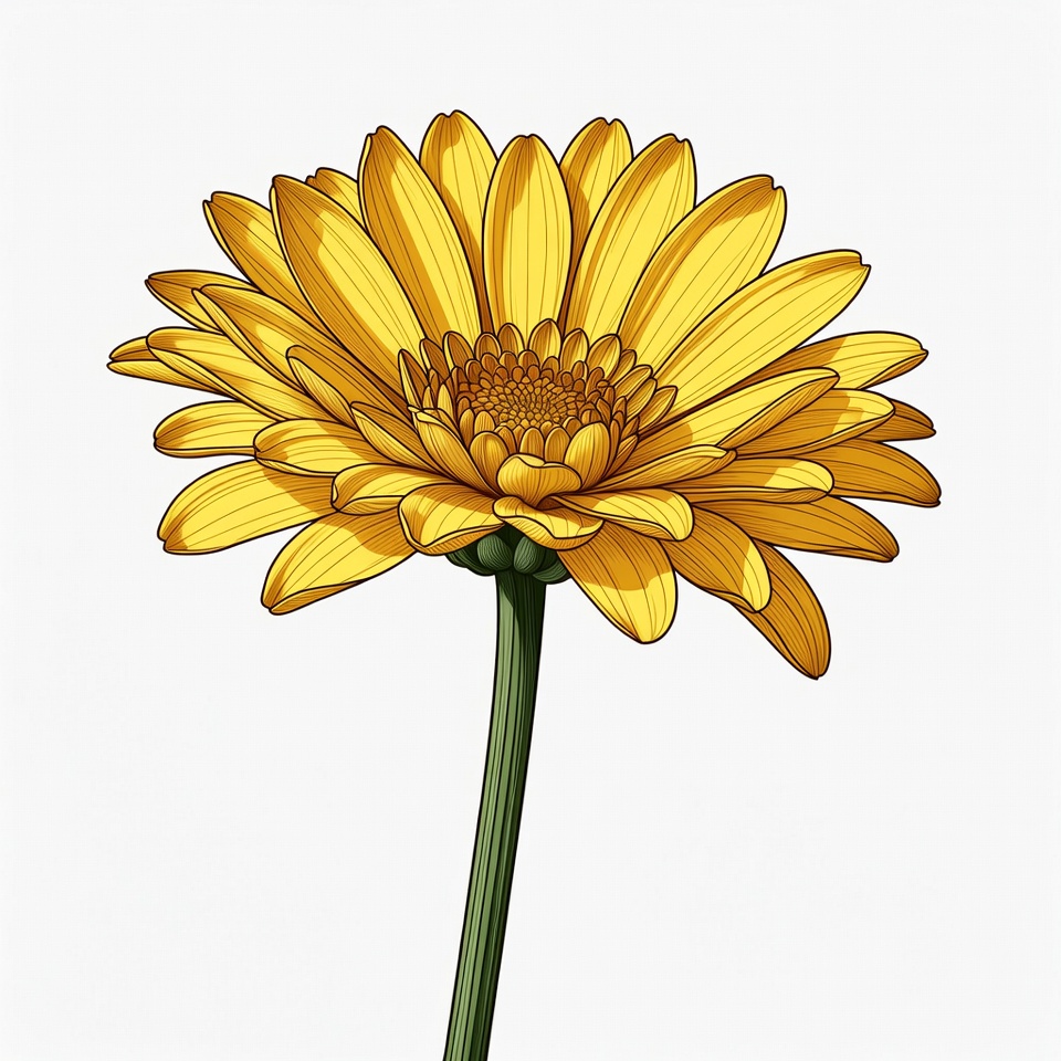 bloom, bright yellow, clipart, daisy, floral, flower, flower center, gerber daisy, green stem, illustration, isolated background, nature, white background, yellow petals, yellow flower