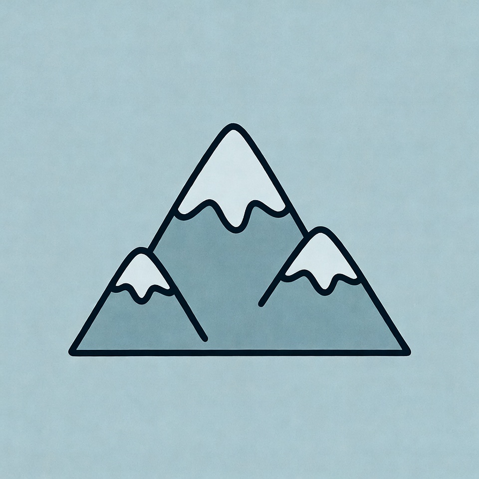 A simple line drawing illustration features three snow-capped mountains on a light blue background. The peaks are outlined in black with white snow highlights and shaded blue bases. The design is minimalist and isolated against the solid background.