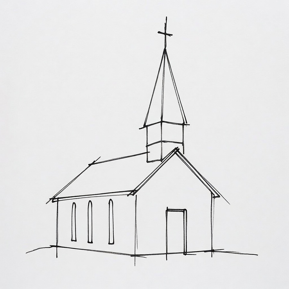 A simple black line drawing depicts a small church with a tall steeple topped by a cross. The structure features a gabled roof, arched windows on the side, and a front door. It is illustrated on a plain white background.