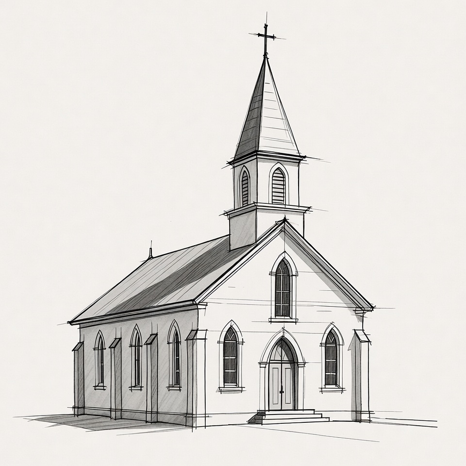 A detailed line drawing illustrates a small church with a tall pointed steeple topped by a cross. The building features arched windows, a wooden front door, and a sloped roof on an isolated white background. Gothic-style architectural elements are rendered in grayscale pencil sketch.