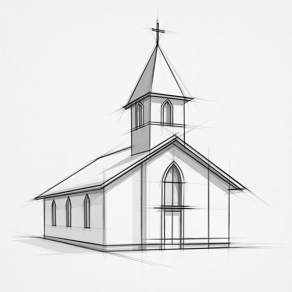 A detailed line drawing sketch illustrates a simple church with a tall steeple topped by a cross. The church features arched windows, a front door, and a sloped roof, all rendered in white line art on a plain background. The illustration is presented from a three-quarter angle view.