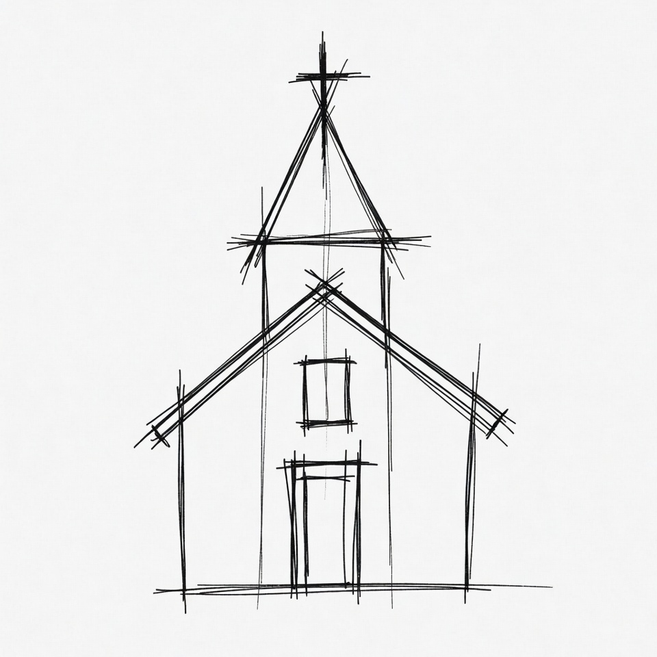 A simple black line drawing of a church features a tall steeple with a cross on top. The structure includes a gabled roof, a central door, and a window. It is rendered in a sketch style on a white background.