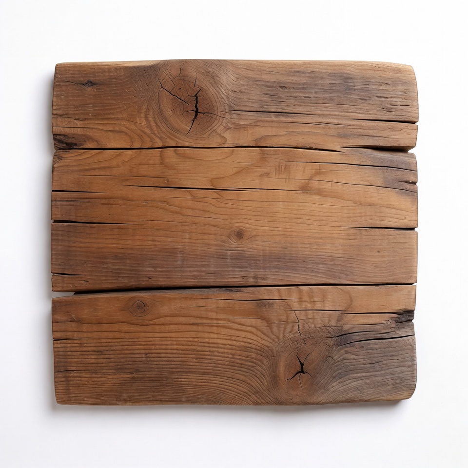 A rectangular blank wooden sign made of weathered planks sits on a white background. The wood features natural knots, cracks, and grain textures typical of aged timber. It is positioned horizontally with rough, uneven edges.