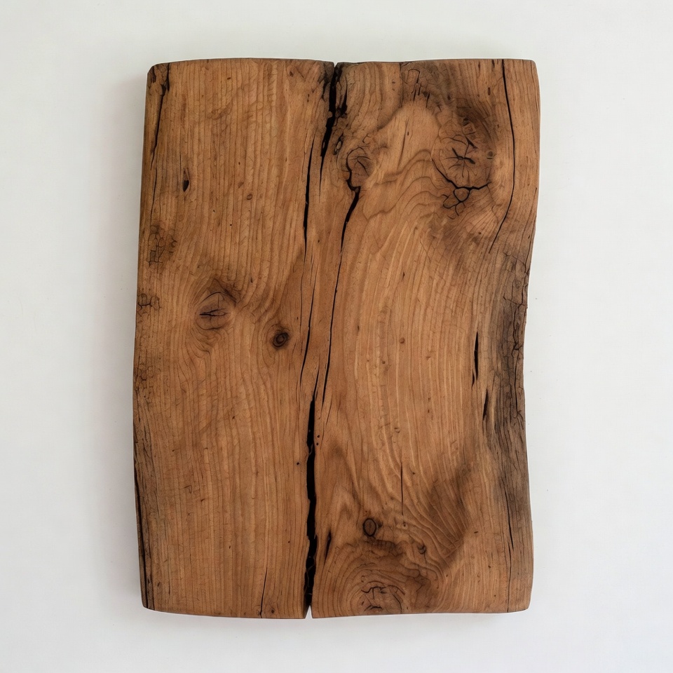 A rectangular wooden cutting board with natural knots and grain patterns stands upright against a white background. The board features a prominent vertical split down the center and irregular, rugged edges. The rich brown wood shows detailed textures and bark remnants.