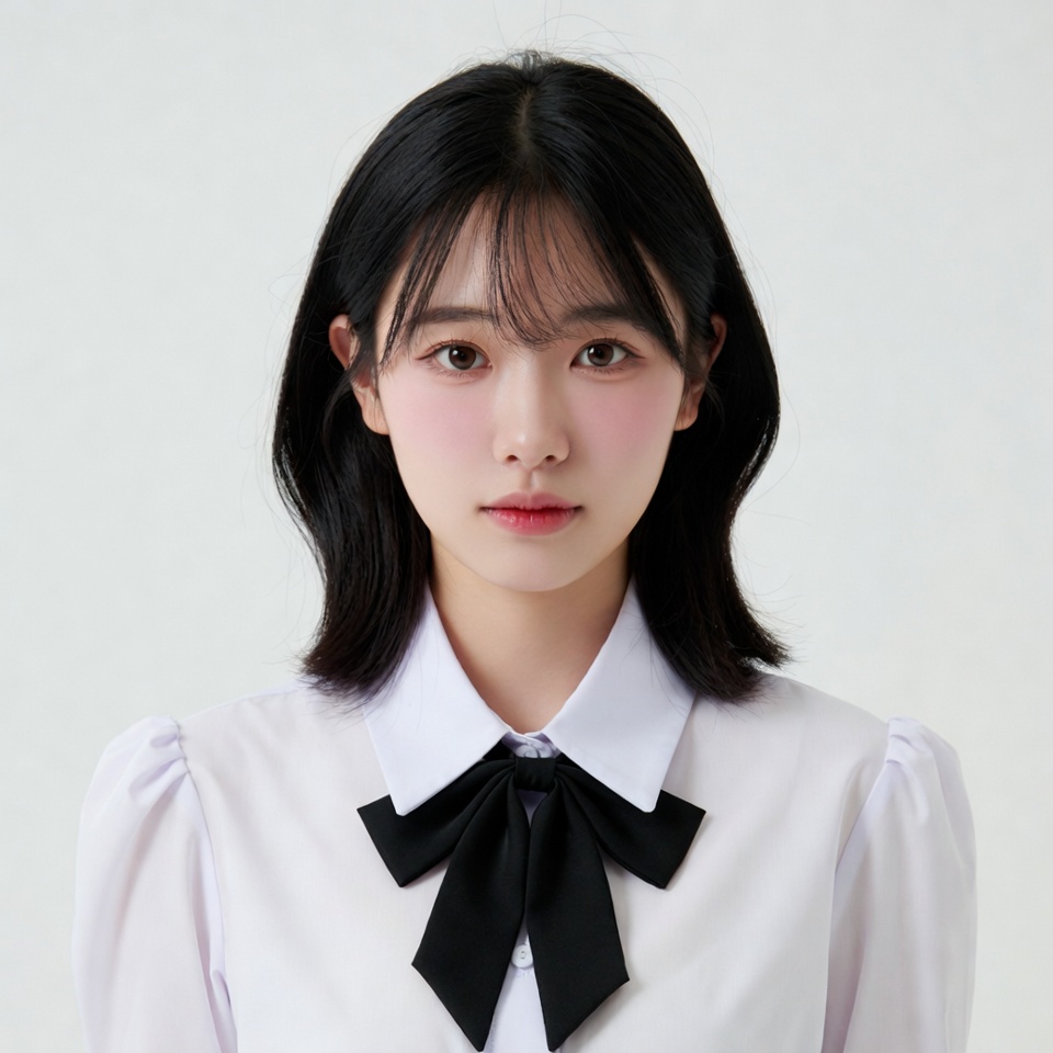 Asian, bangs, black bowtie, black hair, collared shirt, cute, fashion, female, front view, girl, headshot, isolated background, pink blush, portrait, puffed sleeves, school uniform, straight hair, studio photo, white blouse, young woman, Asian girl