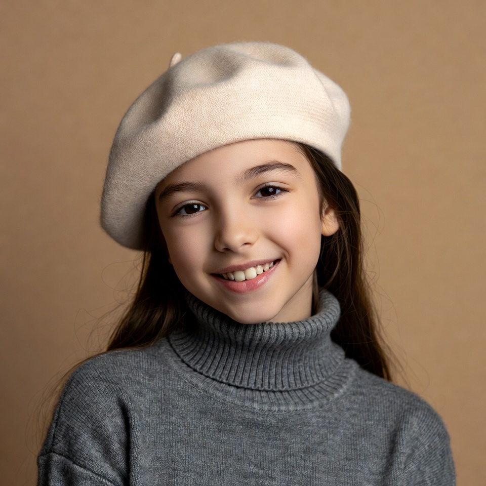 A young girl with long dark hair smiles at the camera while wearing a light beige beret hat. She has on a gray turtleneck sweater and stands against a plain beige background. Her eyes are expressive and her smile is bright.