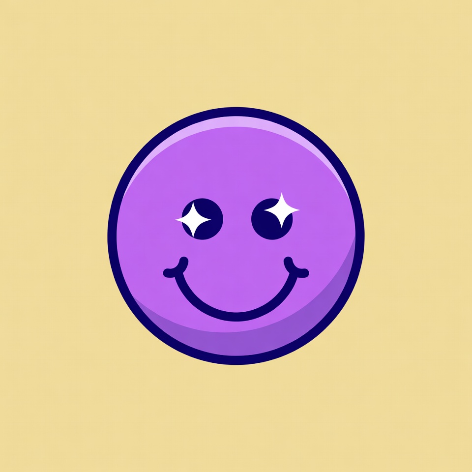 beige background, cartoon face, clipart, digital illustration, emoji icon, excited emoji, happy emoji, illustration, isolated background, purple color, smiley face, smiling face, sparkling eyes, vector art, purple emoji