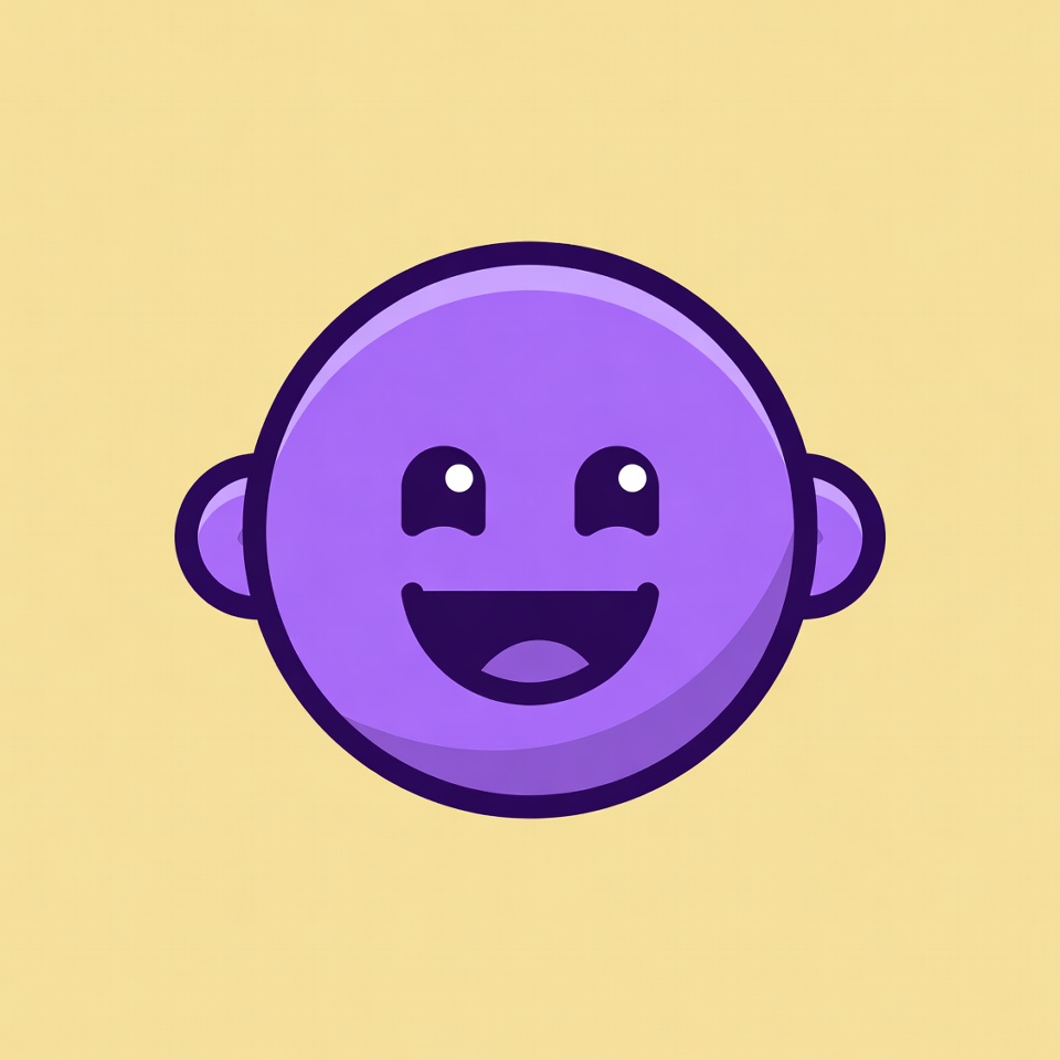 animated face, big eyes, clipart, cute illustration, emoji style, fun character, happy face, isolated background, kawaii, purple face, simple design, smiling face, vector art, wide smile, yellow background, cartoon face