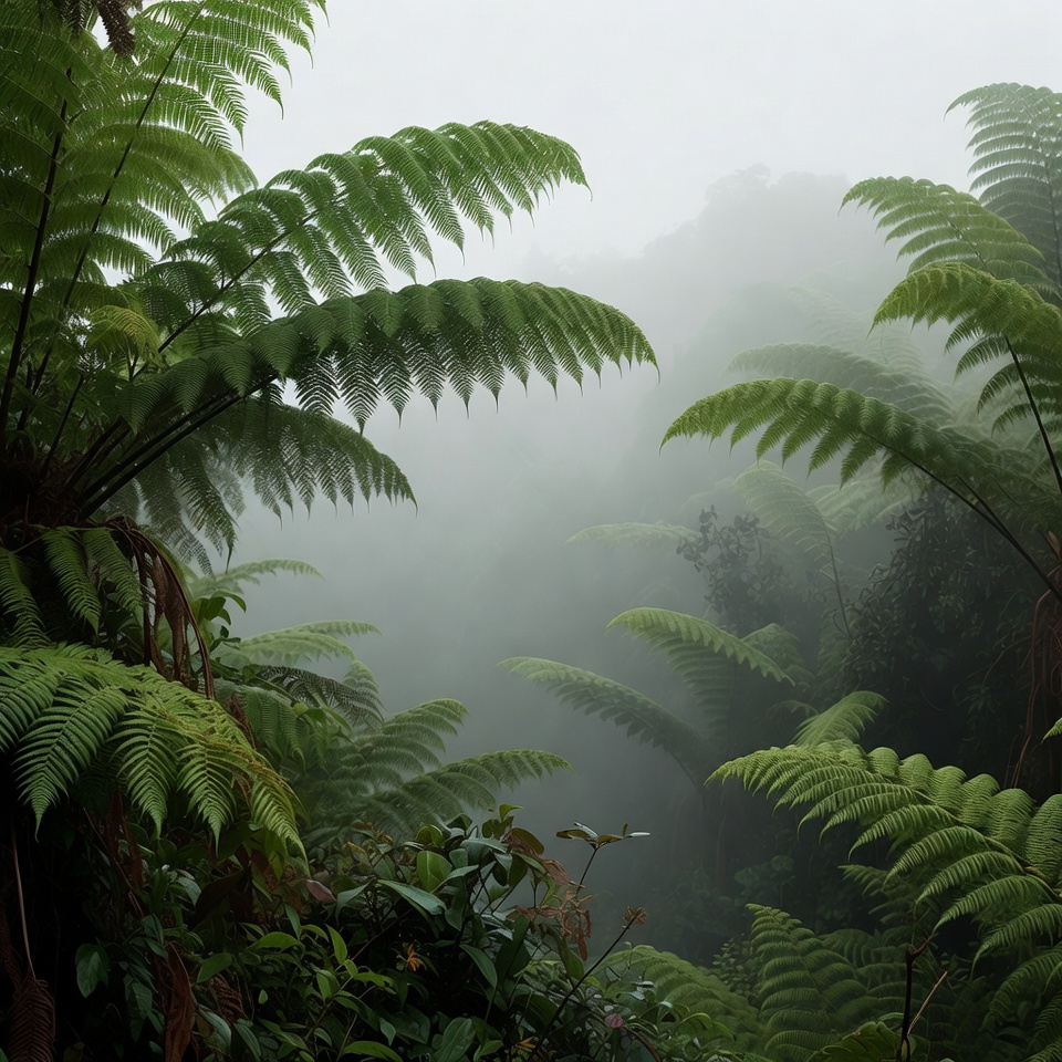 dense foliage, fern canopy, fern fronds, fern leaves, fog, foggy ferns, foggy woods, forest fog, green ferns, green jungle, green plants, humid forest, jungle mist, jungle scenery, lush vegetation, mist, misty background, misty jungle, natural habitat, nature landscape, rainforest, tropical forest, tropical plants, tropical rainforest, wilderness, fern forest