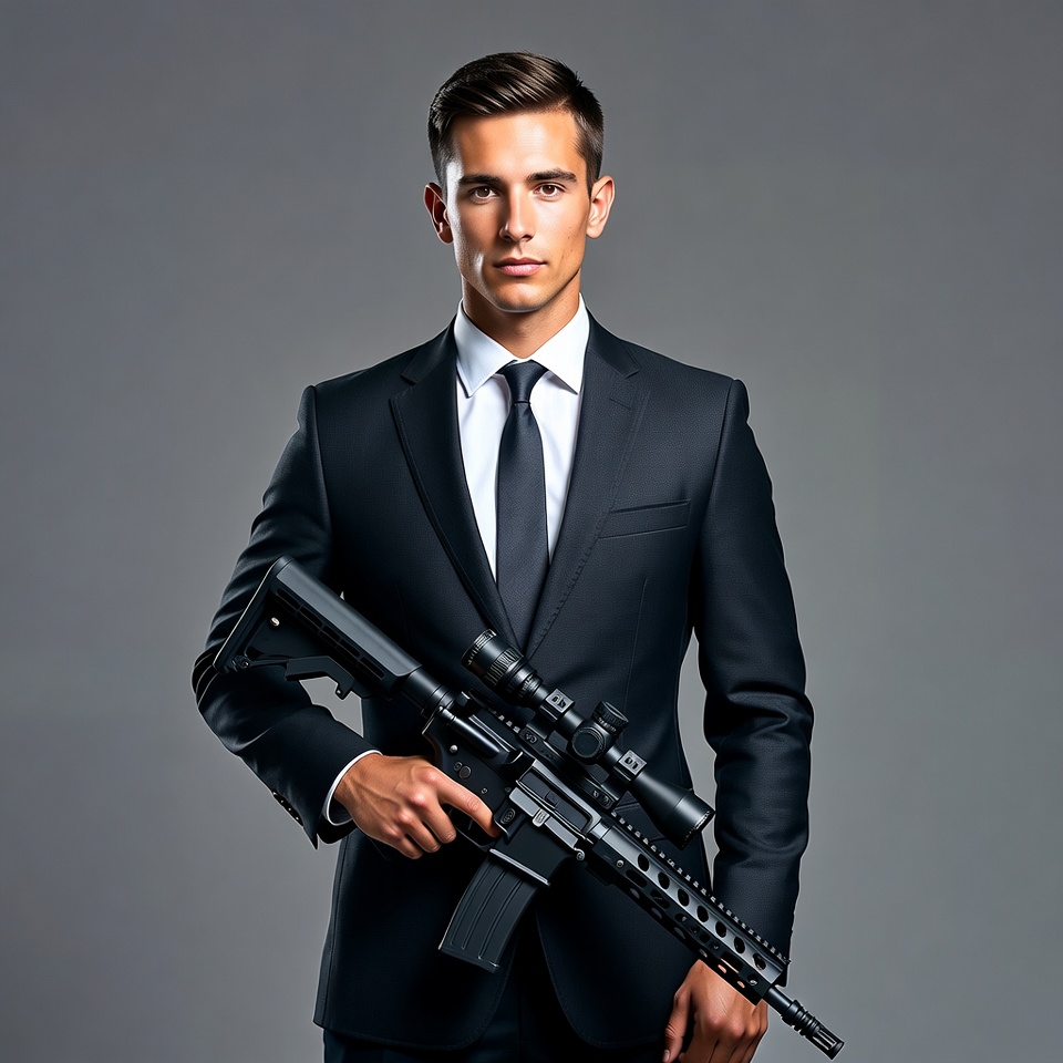 A young White man with short dark hair stands confidently against a gray background, dressed in a dark suit, white shirt, and tie. He holds a black assault rifle with a scope firmly in both hands. His expression is serious and focused.