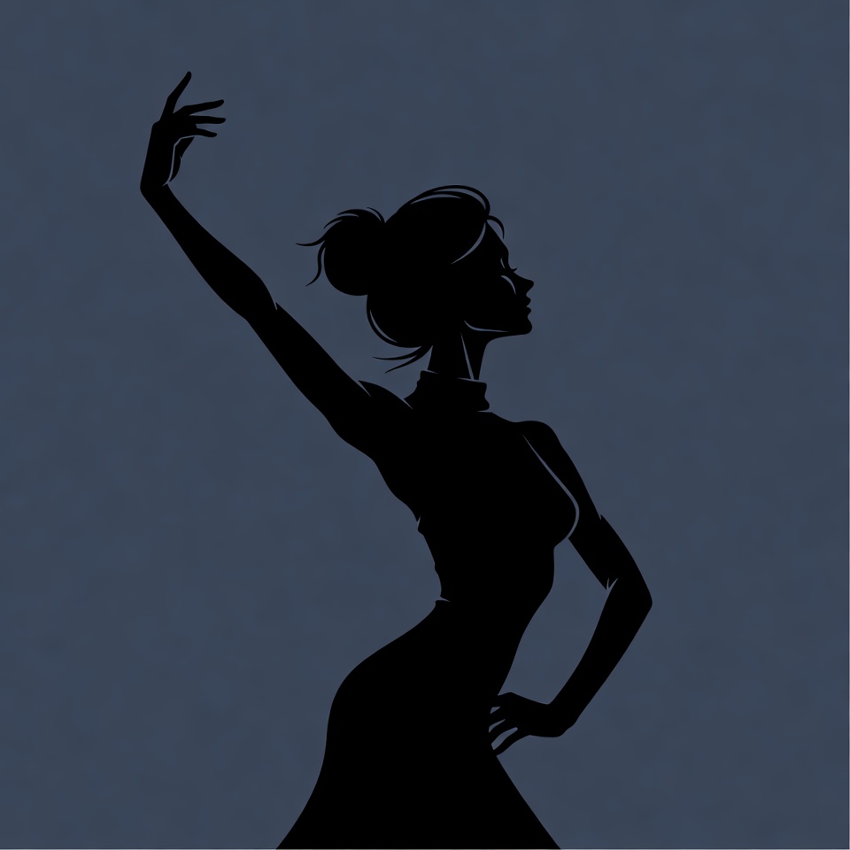 A black silhouette illustration of a woman in profile with a bun hairstyle dances dynamically against a dark blue background. She wears a form-fitting dress with a high collar and extends her arms elegantly in a curved pose. The isolated vector art emphasizes her flowing movement and feminine figure.