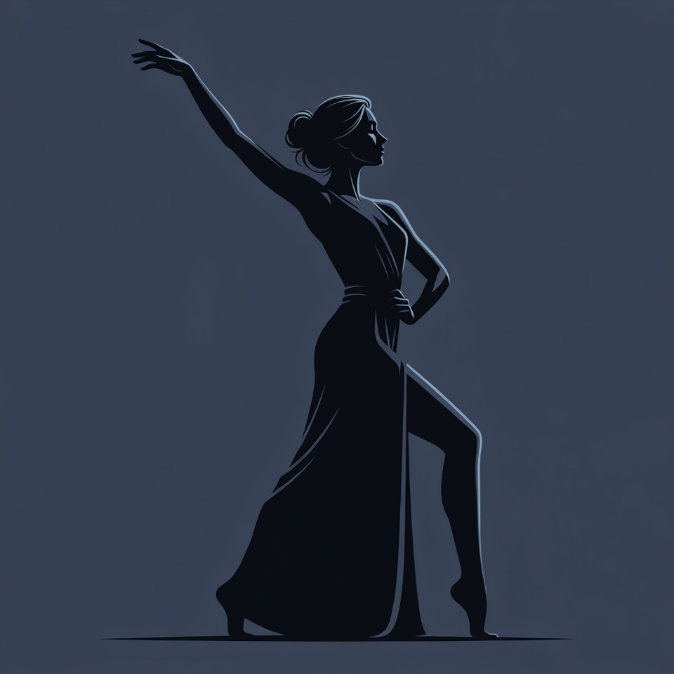 A silhouette illustration of a woman in a flowing dress performs a graceful dance pose. She stands on one foot with her arms elegantly extended and hair in a bun. The dark figure is set against a solid navy background.
