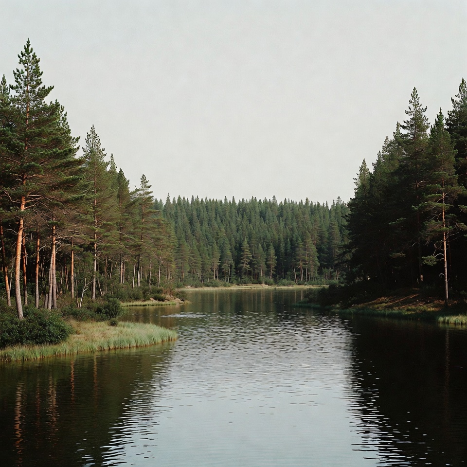 A serene river flows through a dense forest of tall pine trees under a cloudy sky. The water reflects the surrounding greenery and trees on both banks. Reeds and shrubs line the riverbanks, creating a natural frame.