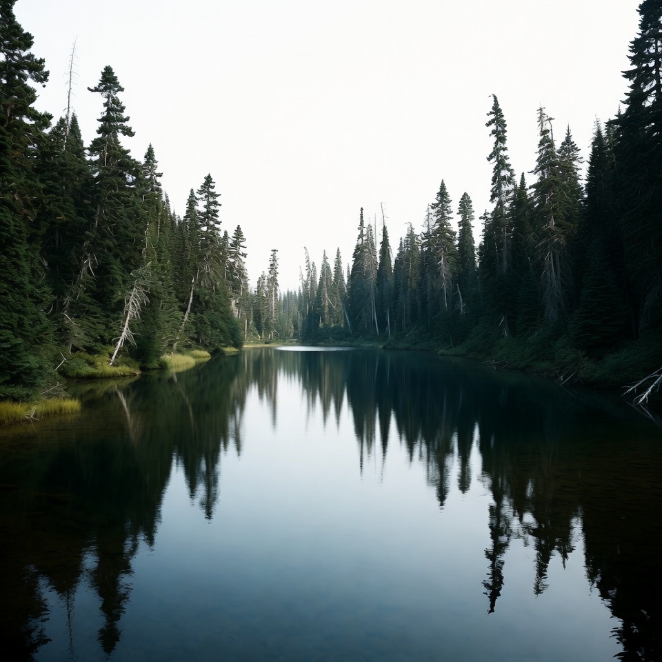 A serene lake is surrounded by dense evergreen trees on both sides, with their reflections perfectly mirrored in the calm blue water. Dead trees and green rushes line the shoreline. The scene features a clear sky and symmetrical natural landscape.