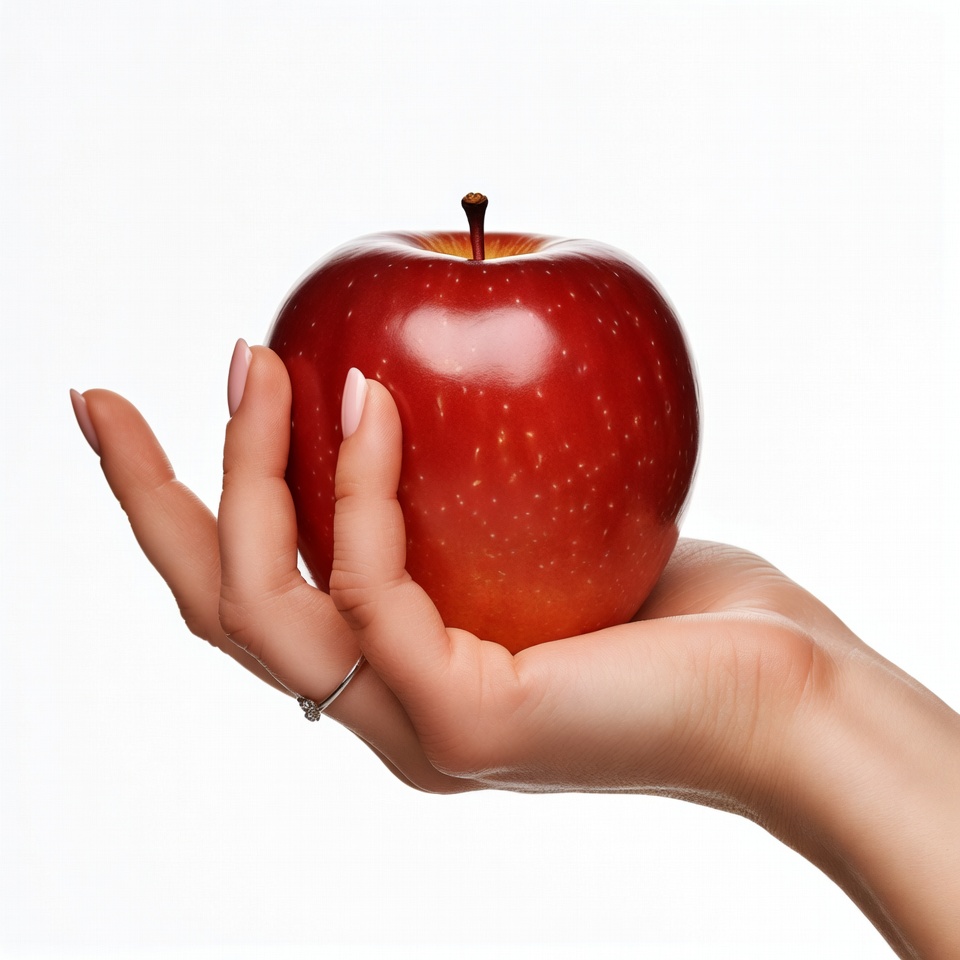 White, apple stem, female, fresh fruit, fruit, hand, healthy food, holding apple, isolated, manicured nails, pink nails, red apple, shiny apple, silver ring, white background, woman
