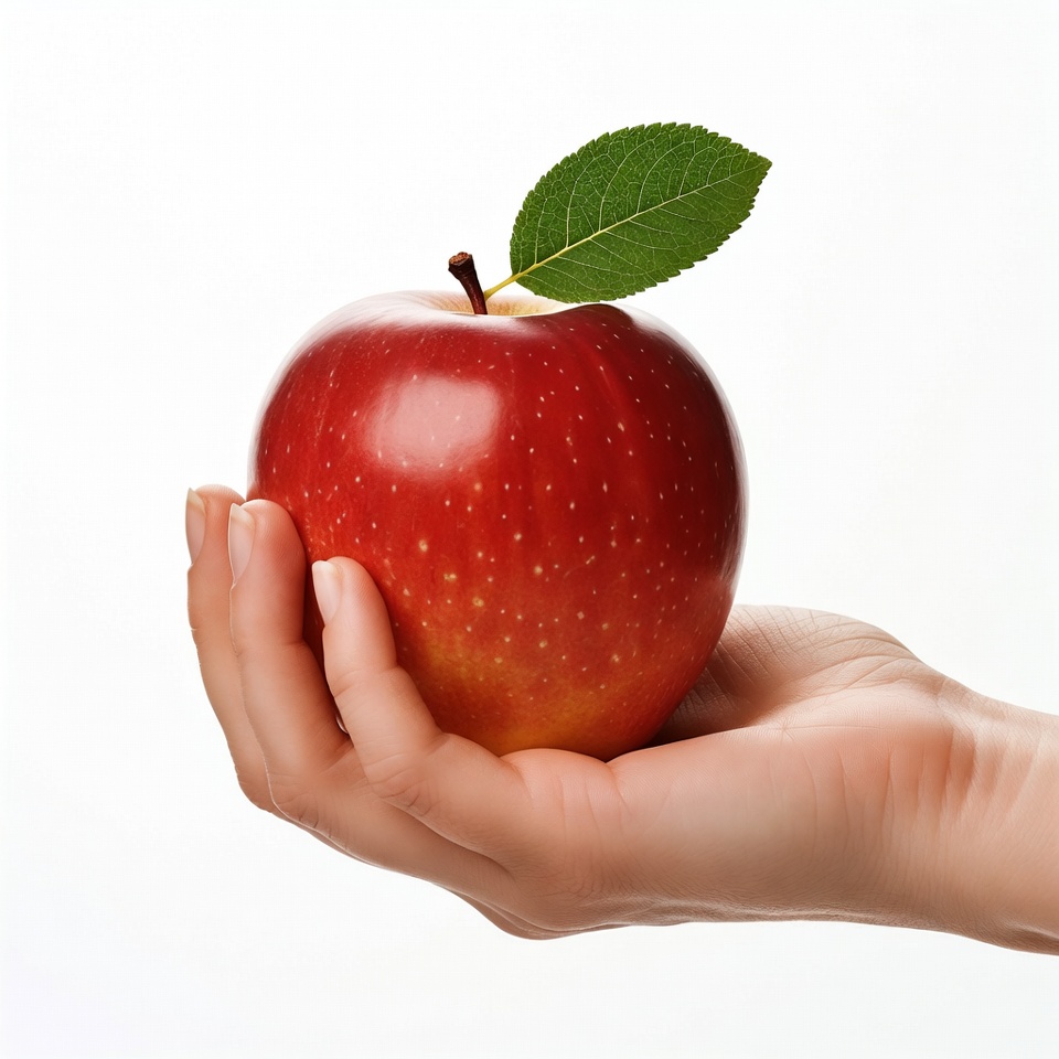 apple, female hand, fresh apple, fruit, green leaf, hand holding apple, healthy fruit, isolated background, shiny apple, stem, white background, woman's hand, red apple