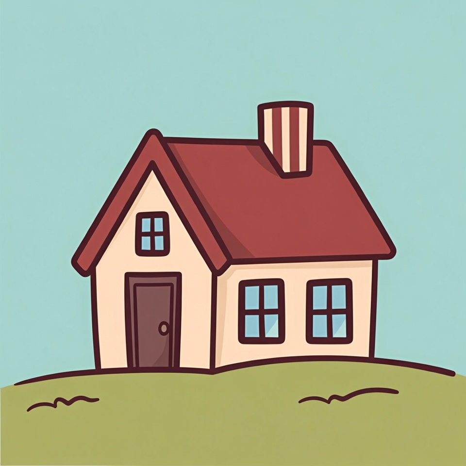 A simple cartoon illustration of a house with beige walls, red roof, chimney, windows, and brown door sits on a green hill. The house features a striped chimney and is outlined in black against a blue sky. The style is cute and hand-drawn.