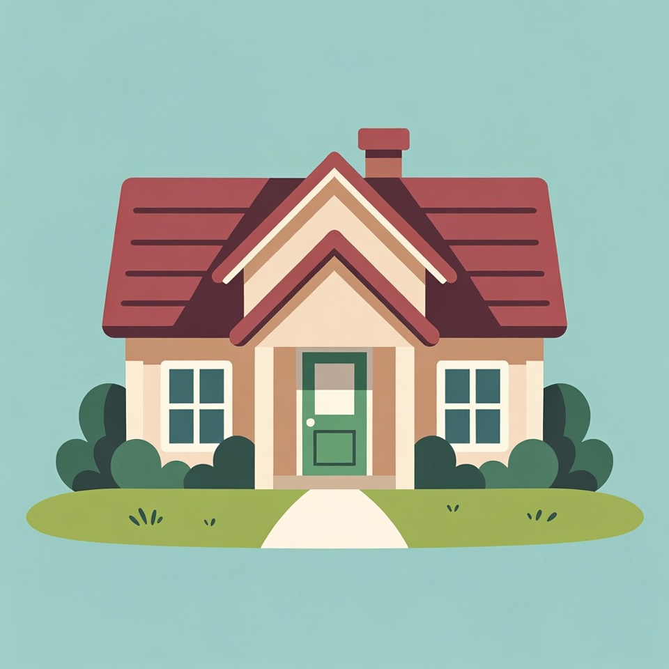 A colorful cartoon illustration of a house features a red gabled roof, beige walls, and a green front door with windows on both sides. Green bushes frame the house, and a stone pathway leads to the entrance on a grassy lawn. The entire scene is set against a light blue background.