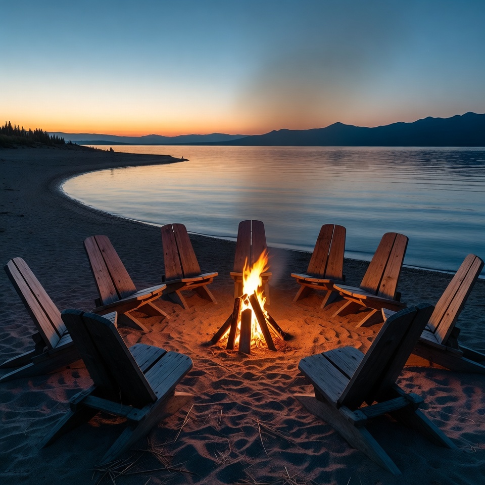 A vibrant campfire burns brightly in the center of a circle of wooden Adirondack chairs arranged on a sandy beach. The scene is set at dusk with a calm lake in the background, surrounded by distant mountains under a colorful sunset sky. The flames illuminate the chairs and sand, creating a warm glow against the cool blue water.
