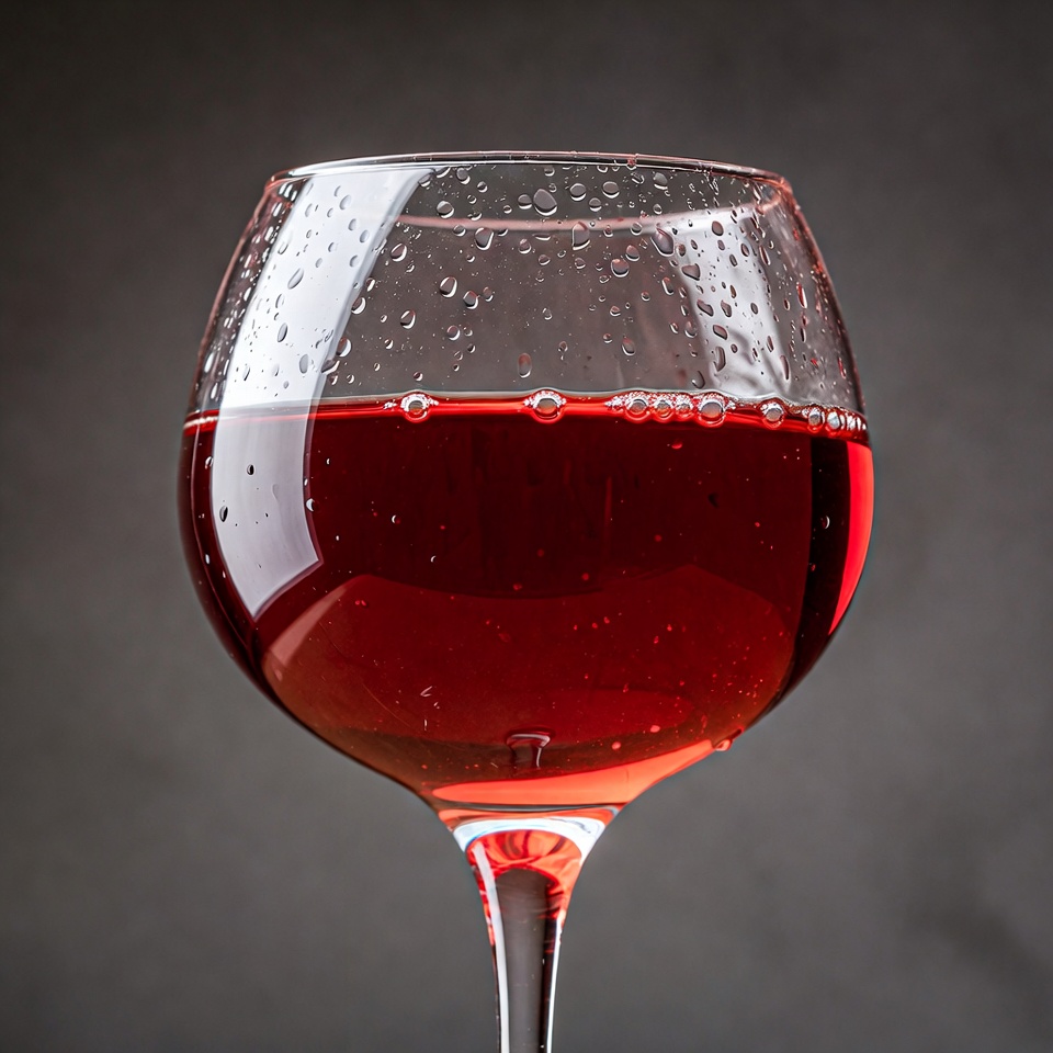 A tall wine glass filled with deep red wine sits against a dark gray background. Water droplets cover the exterior of the clear glass, with bubbles visible in the liquid. The stem and base of the glass are also detailed with subtle reflections.