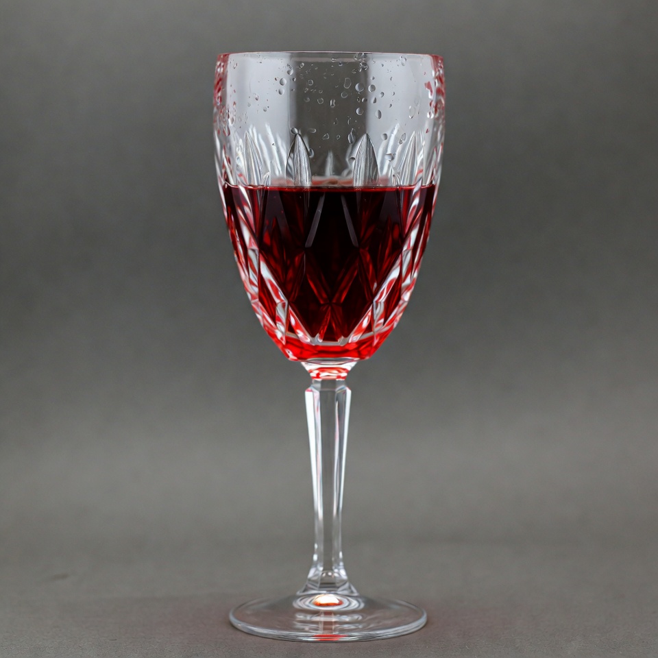 A elegant crystal wine glass filled with red wine stands on a gray background. The glass features intricate faceted patterns and water droplets on its surface. The deep red wine contrasts sharply with the clear glass.