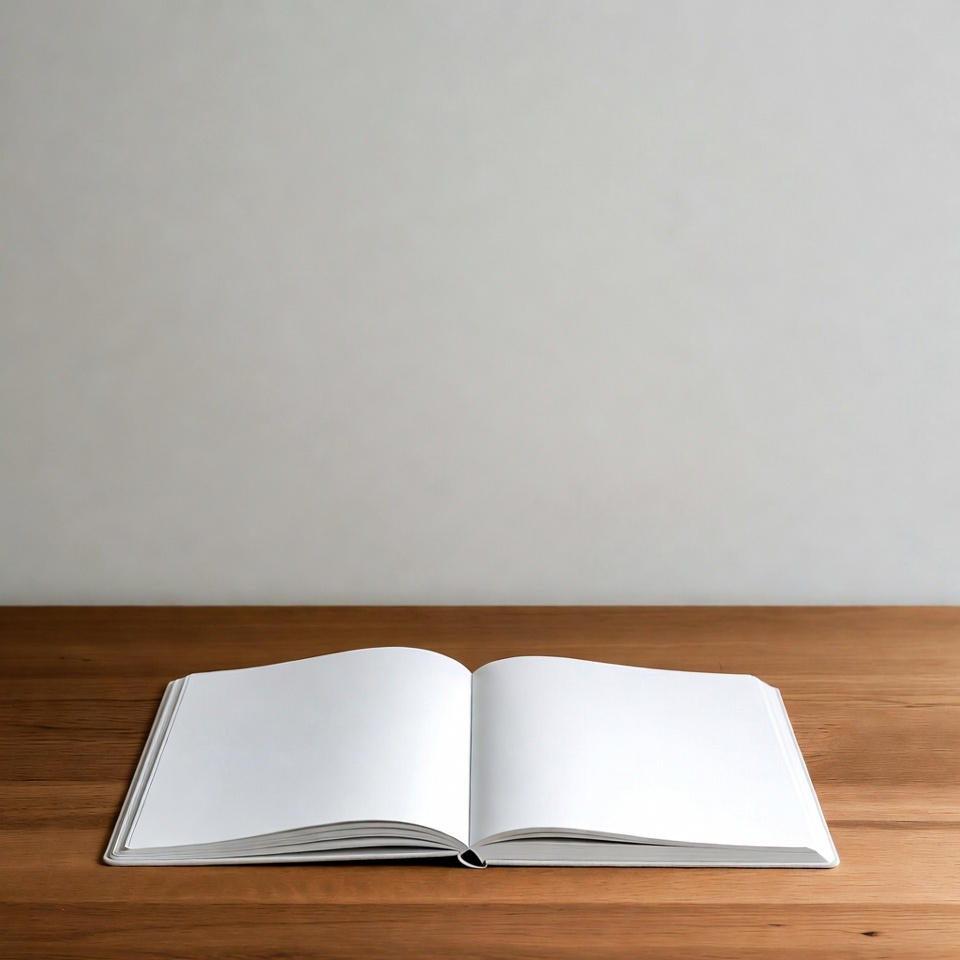 An open notebook with blank white pages rests on a wooden table. The notebook is positioned centrally with its cover slightly visible. A plain white wall serves as the background.
