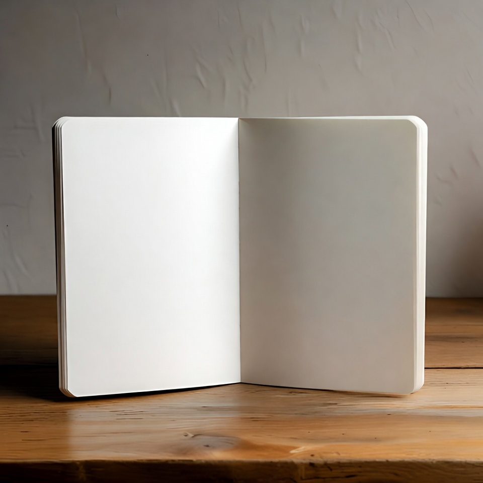 blank notebook, blank pages, book, empty pages, gray wall, isolated background, journal, office supplies, open notebook, paper, stationery, white notebook, wood surface, wooden table, writing pad, notebook