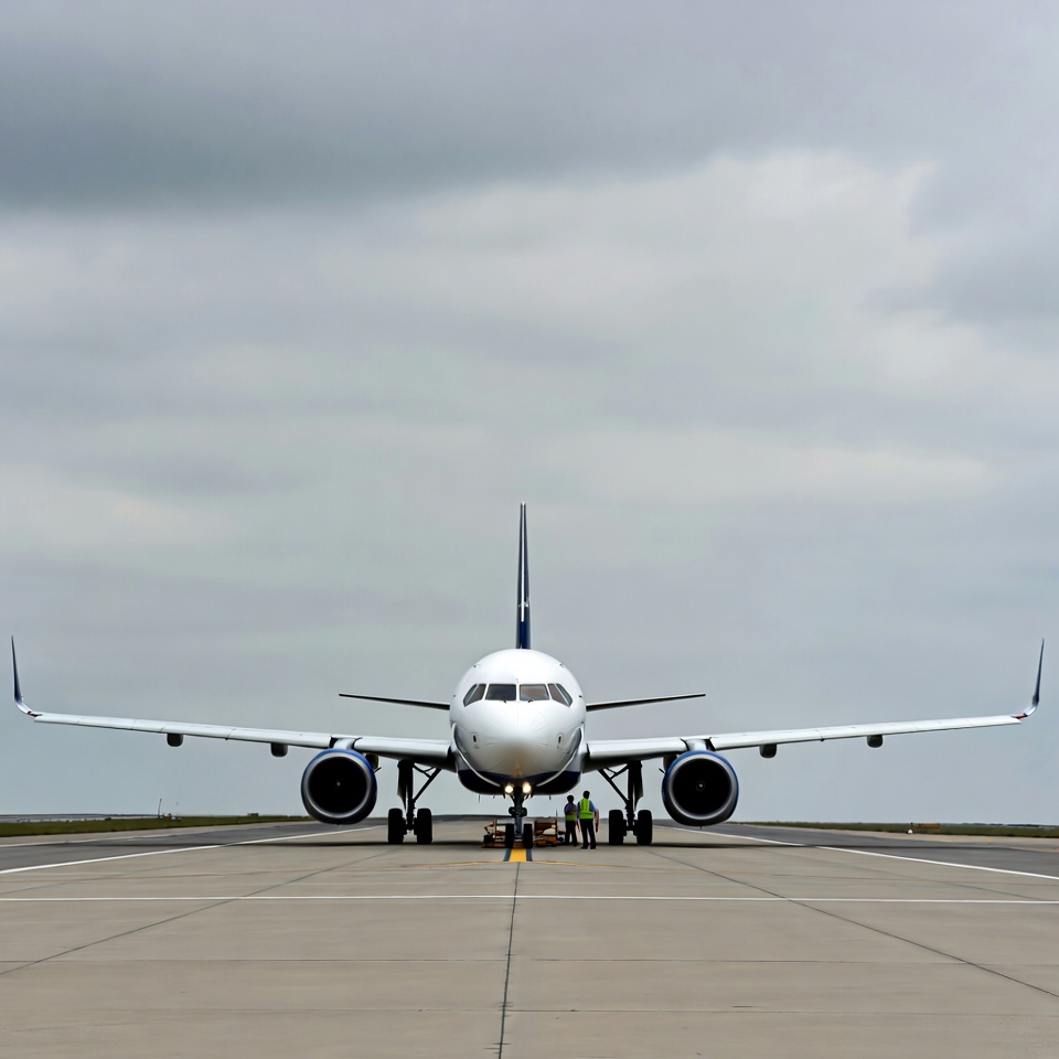 A white commercial airplane with blue accents and tail stands on a gray tarmac under a cloudy sky. Two ground crew members in orange vests stand near the nose and landing gear. The aircraft faces forward with engines visible and wings extended.