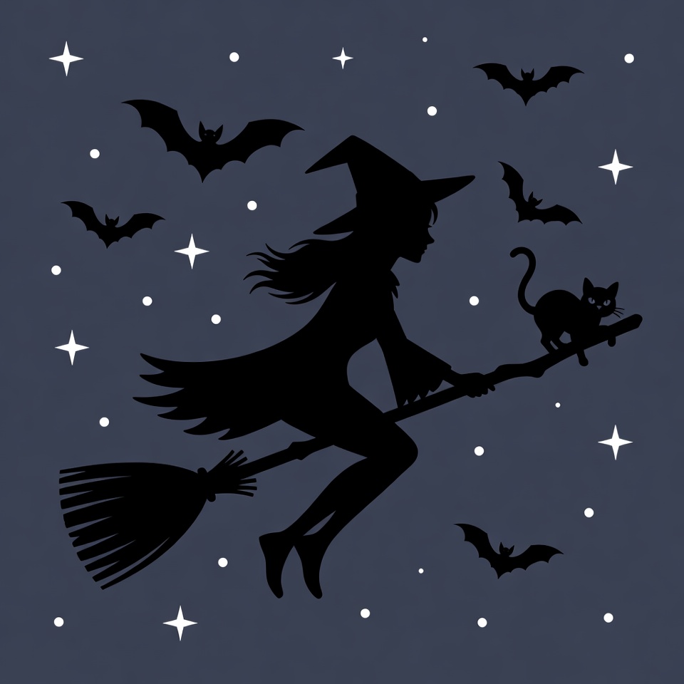A black silhouette illustration of a young woman as a witch flying on a broomstick against a dark blue night sky. She wears a pointed hat, flowing dress, and holds a black cat, surrounded by flying bats and sparkling stars. The image features a Halloween theme with isolated elements on a starry background.