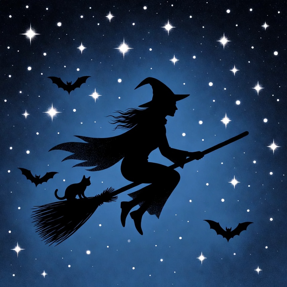 A black silhouette illustration of a witch with long flowing hair and pointed hat flies on a broomstick against a starry night sky. A black cat sits on the broom, and bats fly nearby. The image features glowing stars and a dark blue background.
