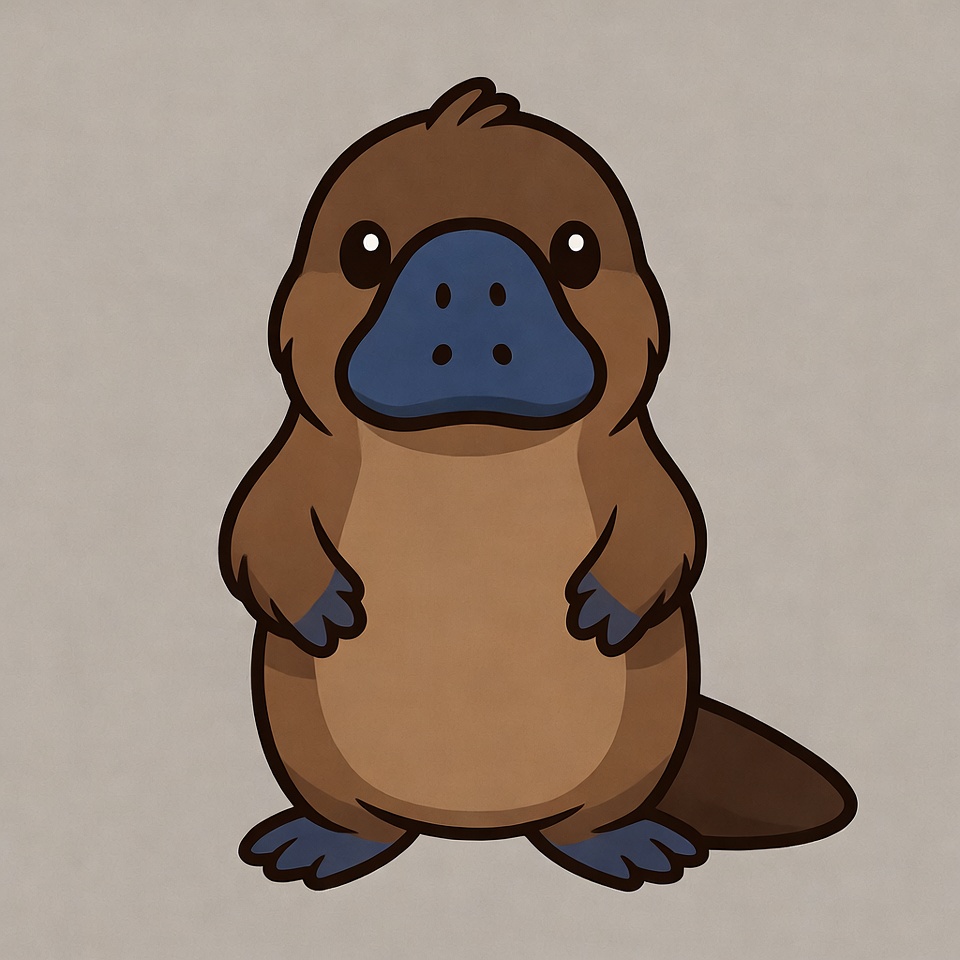 animal, big eyes, blue bill, brown fur, cartoon platypus, chibi, clipart, cute platypus, furry animal, illustration, isolated background, kawaii, standing, webbed feet, platypus