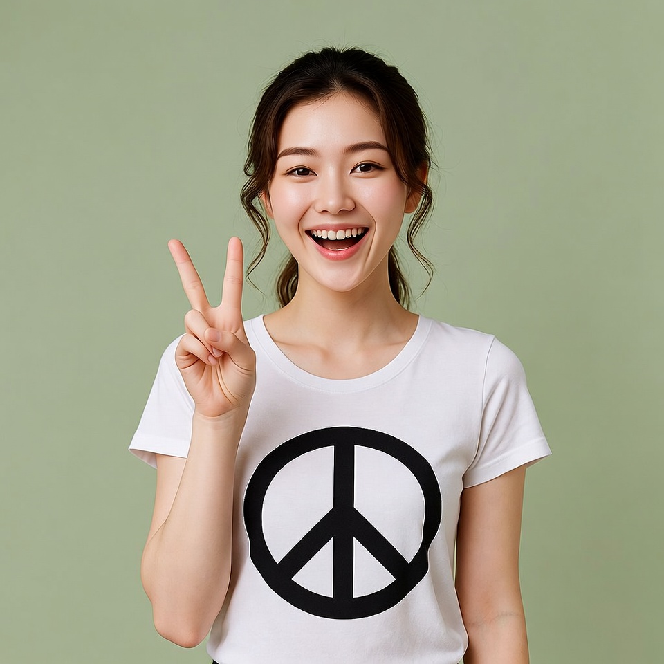 A young Asian woman with long dark hair styled in loose waves smiles brightly while making a peace sign with her fingers. She wears a white t-shirt featuring a large black peace symbol. She stands against a solid light green background.