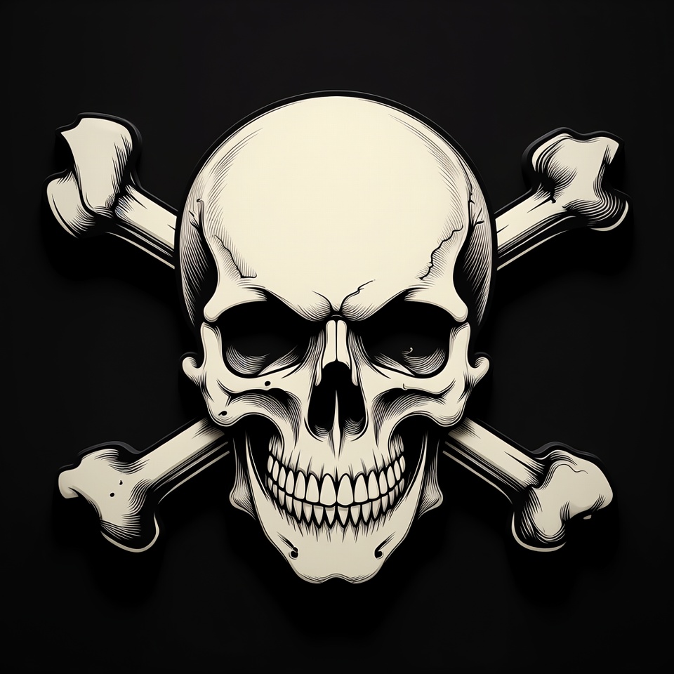 black background, bones, crossbones, crossed bones, danger sign, death icon, graphic art, halloween, illustration, isolated background, ominous symbol, pirate symbol, skull illustration, white skull, skull