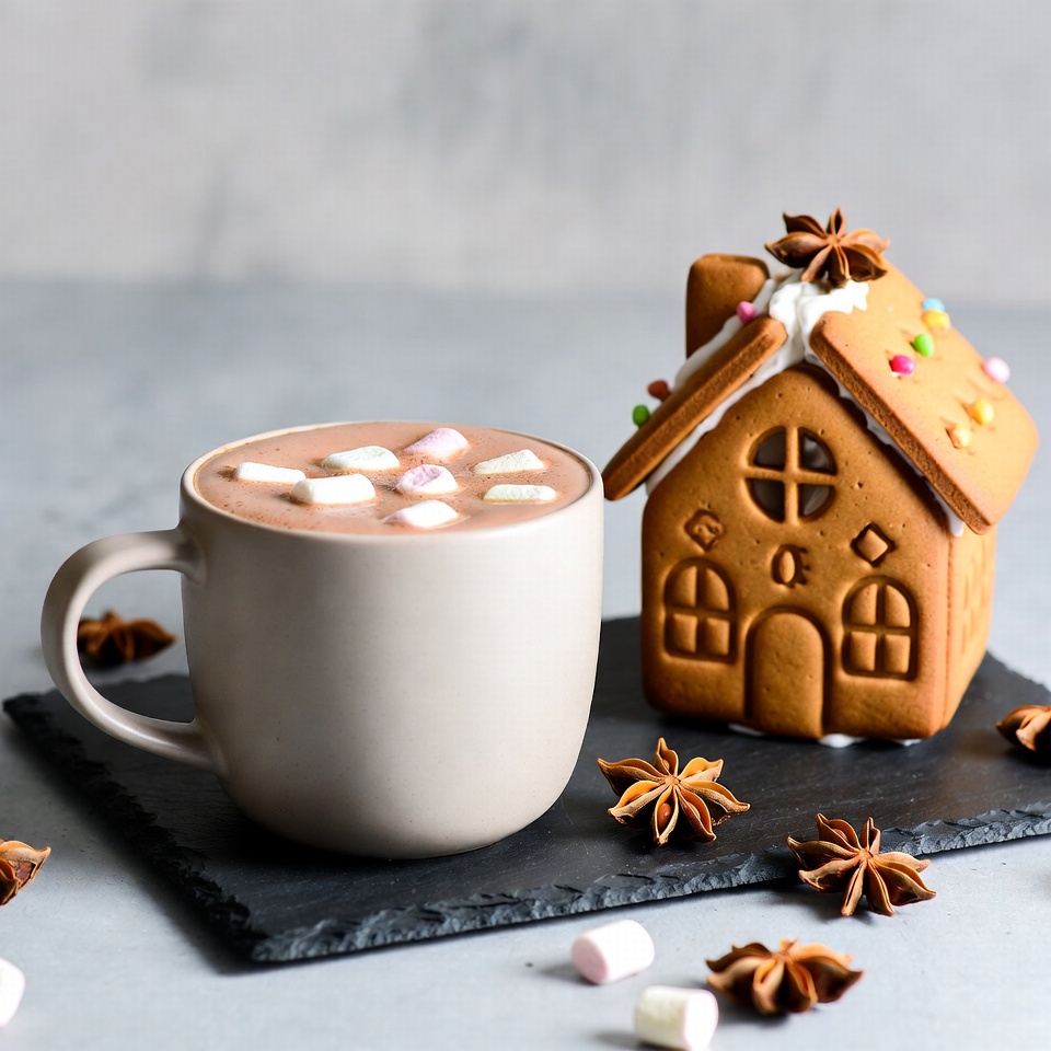 A white mug filled with hot chocolate topped with marshmallows sits on a black slate beside a detailed gingerbread house decorated with icing and candies. Anise stars garnish the mug and slate. Scattered marshmallows and additional anise stars enhance the festive display on a light gray background.