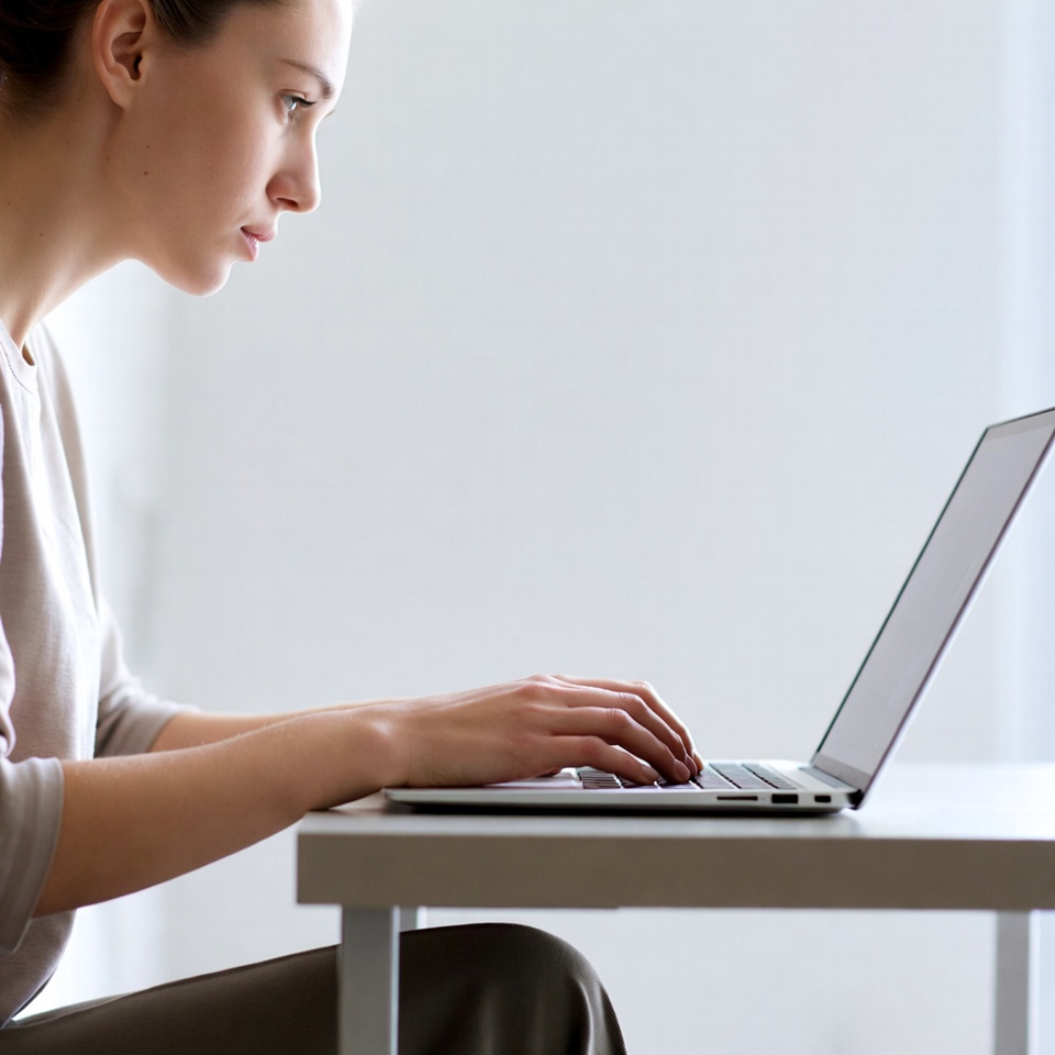 A young woman with hair in a bun sits at a table typing on a silver laptop. She wears a light-colored top and dark pants, leaning forward with a focused profile view. The setting features a plain white background and simple wooden table.