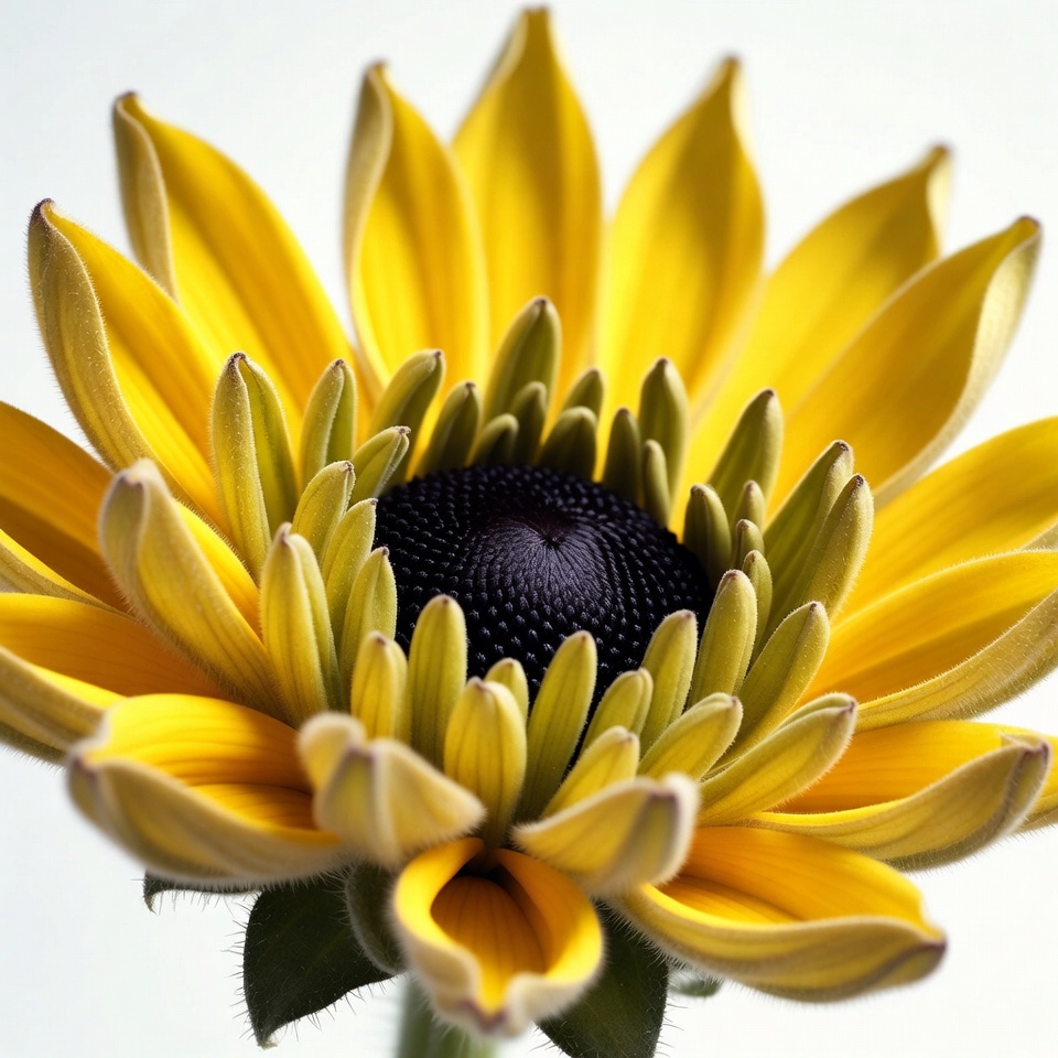 bloom, brown center, floral, flower center, flower closeup, green sepals, isolated, macro, nature, petals, stem, white background, yellow flower, yellow petals, sunflower