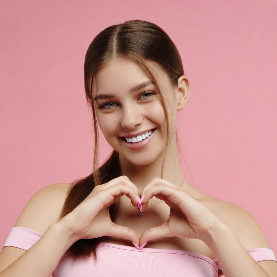 A young woman with long brown hair in a ponytail smiles brightly while forming a heart shape with her hands over her chest. She wears a pink off-shoulder top and stands against a solid pink background. Her green eyes sparkle as she poses confidently.