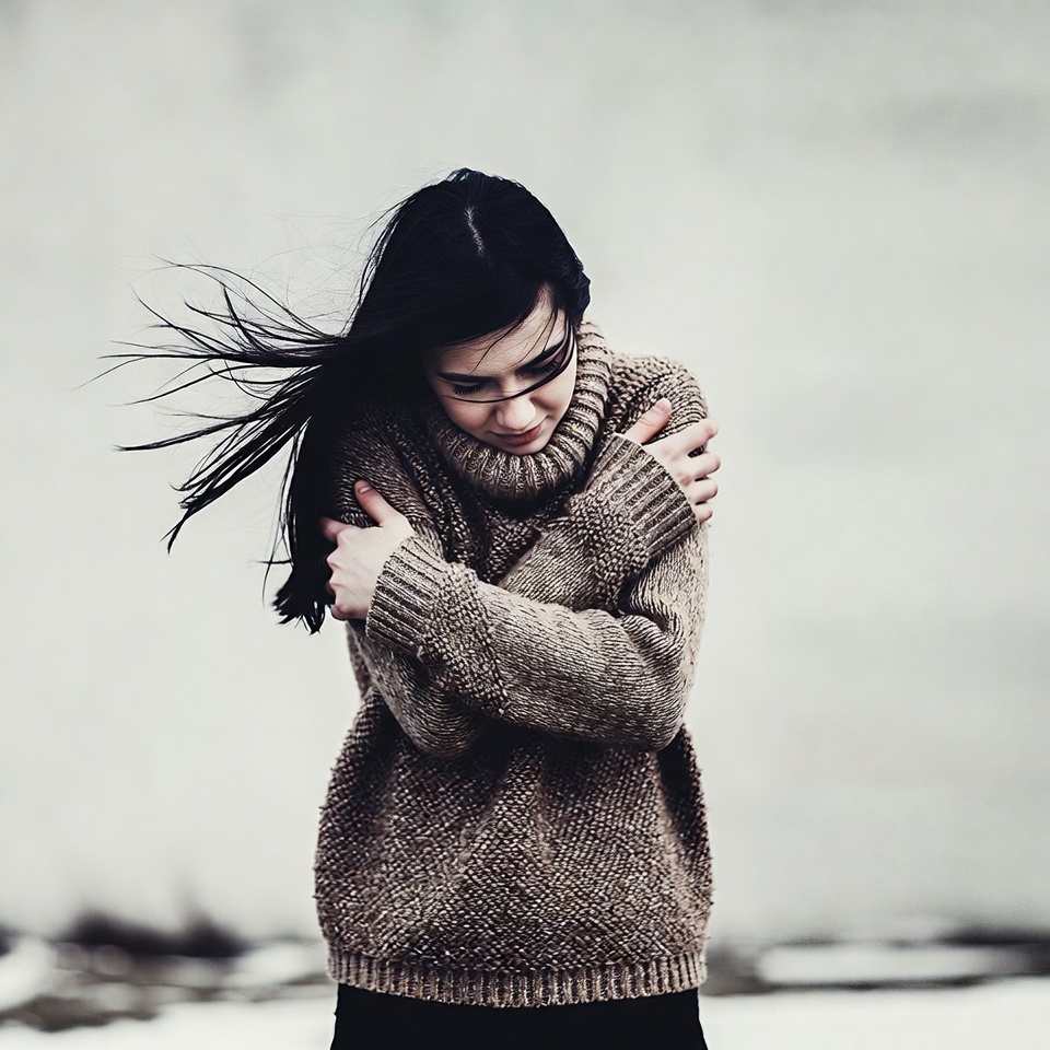 Woman hugging herself in sweater