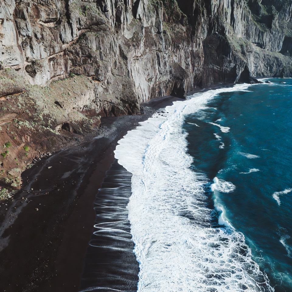 Atlantic coast, Canary Islands, aerial view, beachfront, black beach, cliffs, coast, coastal cliffs, dark sand, dramatic landscape, landscape, nature, ocean waves, oceanfront, rock formations, rugged cliffs, sandy shore, sea foam, seascape, shoreline, turquoise ocean, volcanic beach, wave patterns, white waves, black sand beach