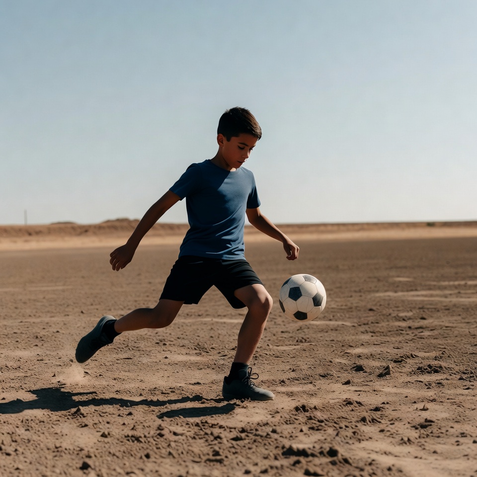 A young boy with short dark hair kicks a white soccer ball in a vast sandy desert. He wears a blue t-shirt, black shorts, and gray sneakers while balancing on one foot. The clear blue sky and barren dunes surround him.