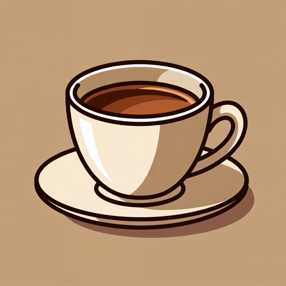 A simple illustration of a white ceramic cup filled with dark brown coffee sits on a matching saucer. The cup features a curved handle and smooth highlights for a glossy appearance. The design is presented on a solid beige background.