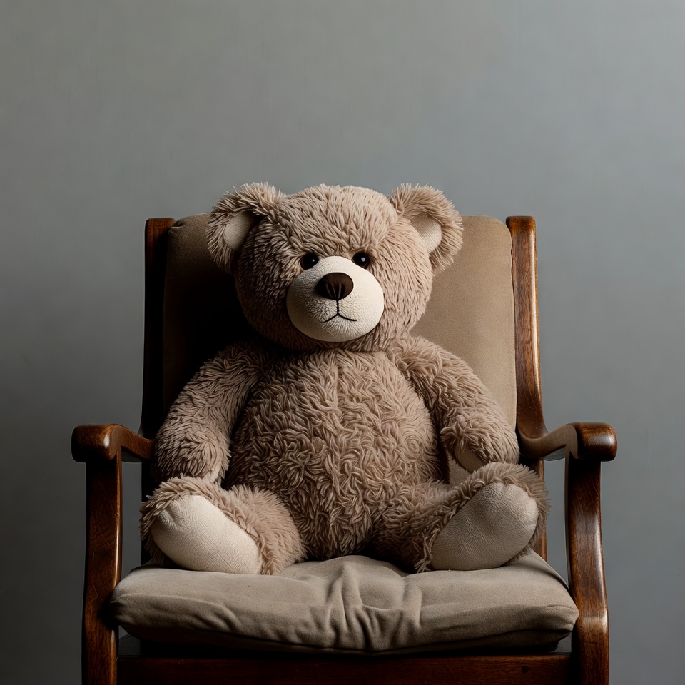 A fluffy brown teddy bear sits relaxed in a vintage wooden armchair with beige upholstery. The bear has a cute face with black eyes and nose, and white paws. It is positioned against a plain gray background.