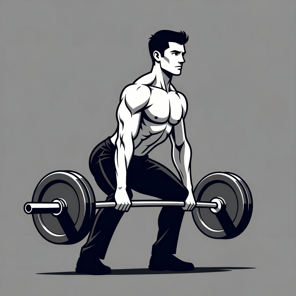 A muscular man with short dark hair performs a deadlift with a heavy barbell. He wears tight black pants and stands on a plain gray background in a dynamic squat position. The image is a bold black line art illustration.