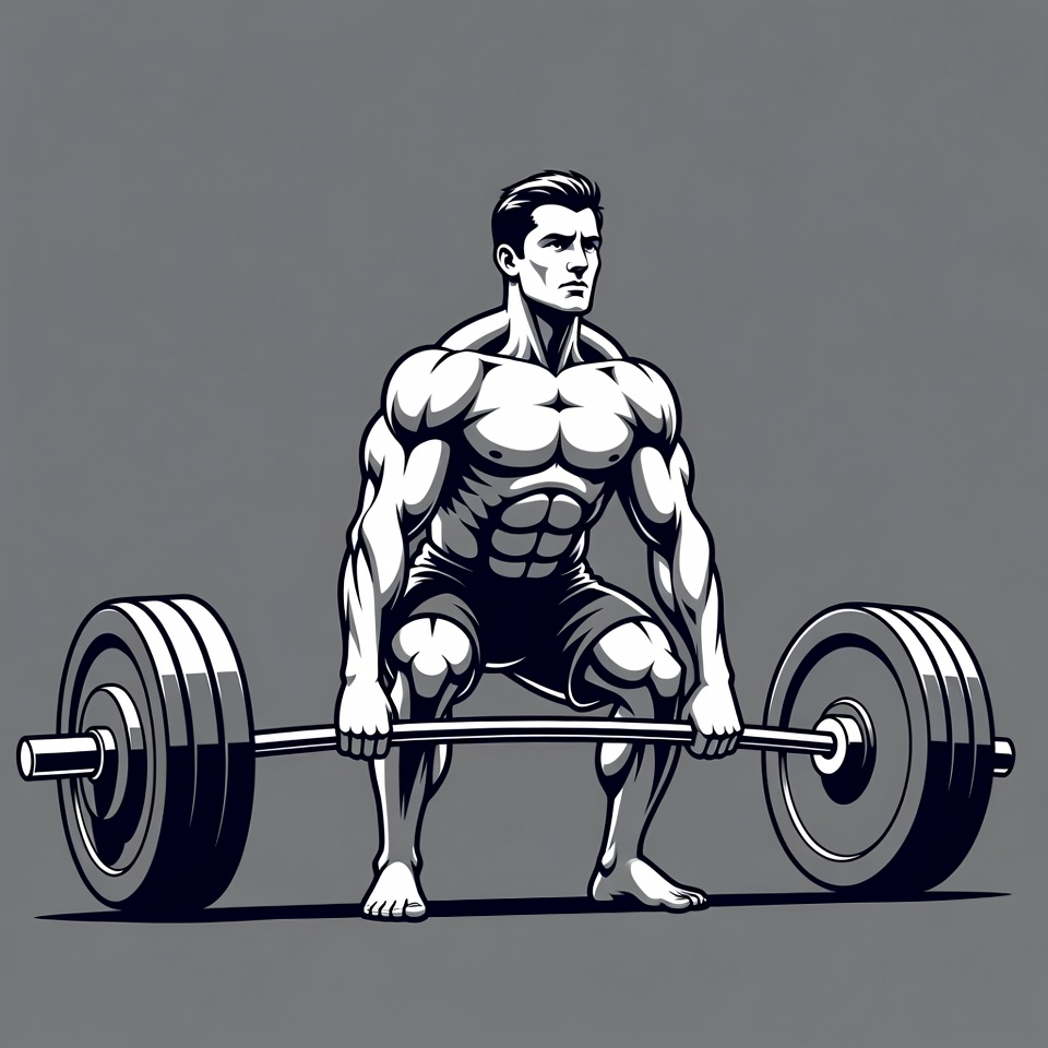 A muscular man with short dark hair squats while lifting a heavy barbell with large weights on each end. He wears short athletic shorts and is barefoot, depicted in a bold black and white line art illustration style. The figure is centered against a plain gray background.