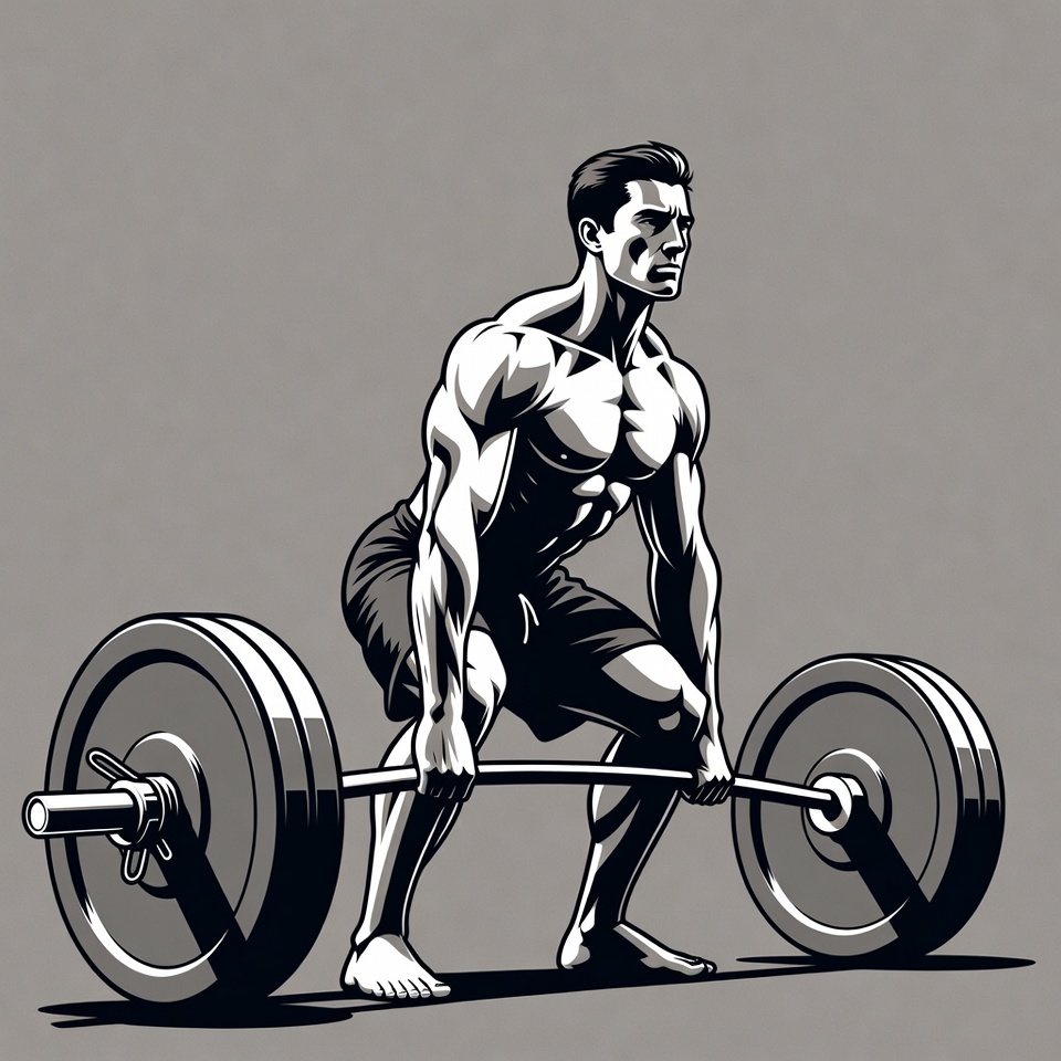 A muscular man with short dark hair squats in a powerful stance, lifting a heavy barbell loaded with large weights. He wears short athletic shorts and is barefoot. The black and white illustration features bold line art on a plain gray background.