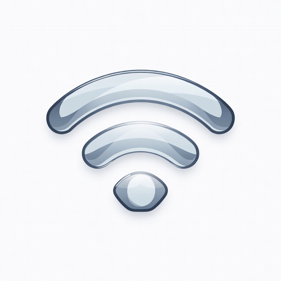 A glossy blue WiFi symbol icon features three curved signal bars arching from a central dot. The design has a transparent, glass-like shine with reflective highlights on a white background. It appears as a 3D vector illustration.